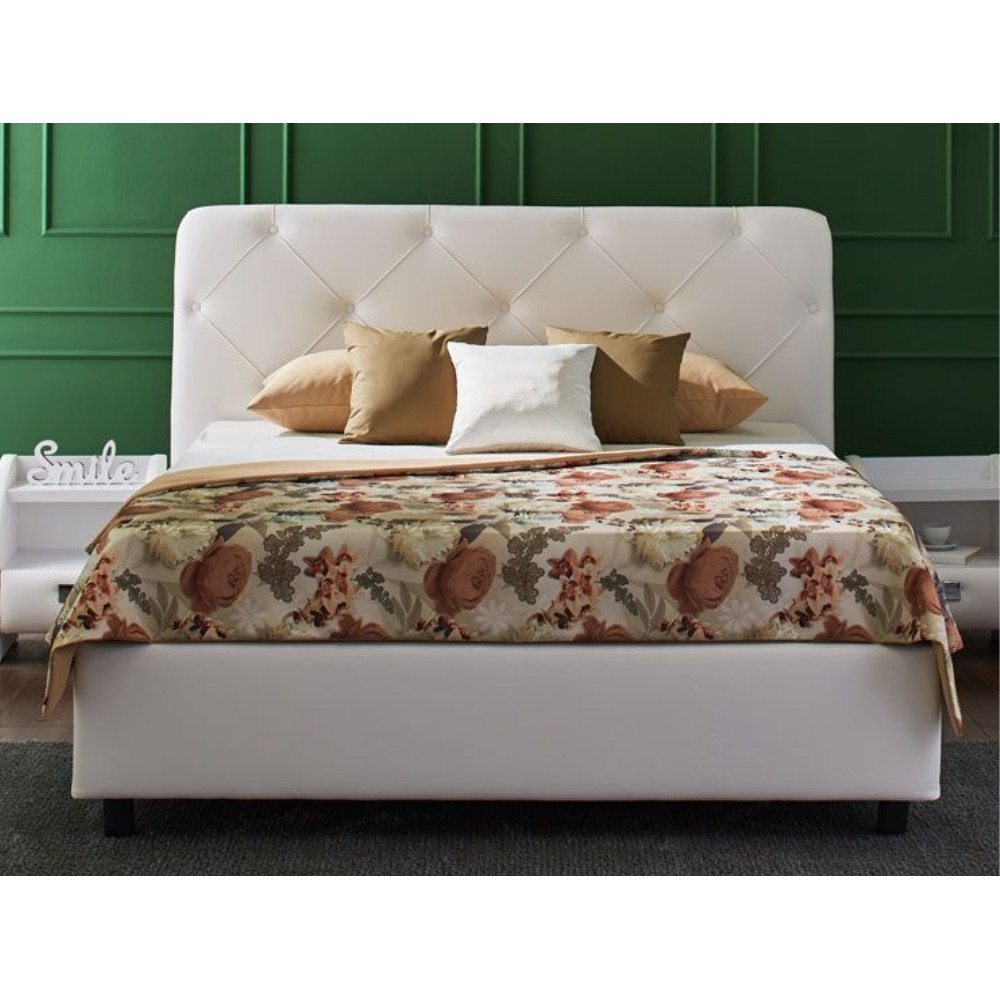 Pat tapitat elegant și practic cu spatiu de depozitare încăpător sub somiera metalică cu lamele și mecanism de ridicare incluse în prețul afișat.