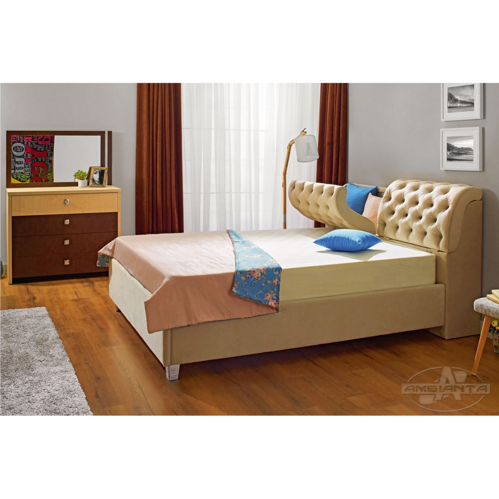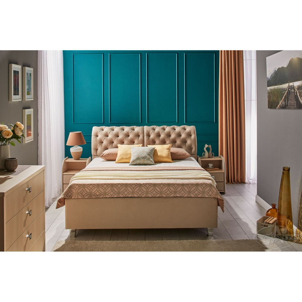 Pat modern din categoria premium cu spătar moale tapițat cu stofă plușată foarte rezistentă si plăcută la atingere.