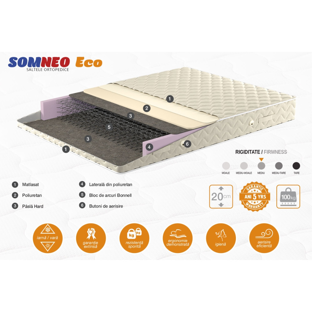 Salteaua Eco este o saltea ortopedica, care oferă un raport optimal preţ/calitate, proiectată pentru un somn sănătos şi pentru a oferi o senzaţie agreabilă de confort.